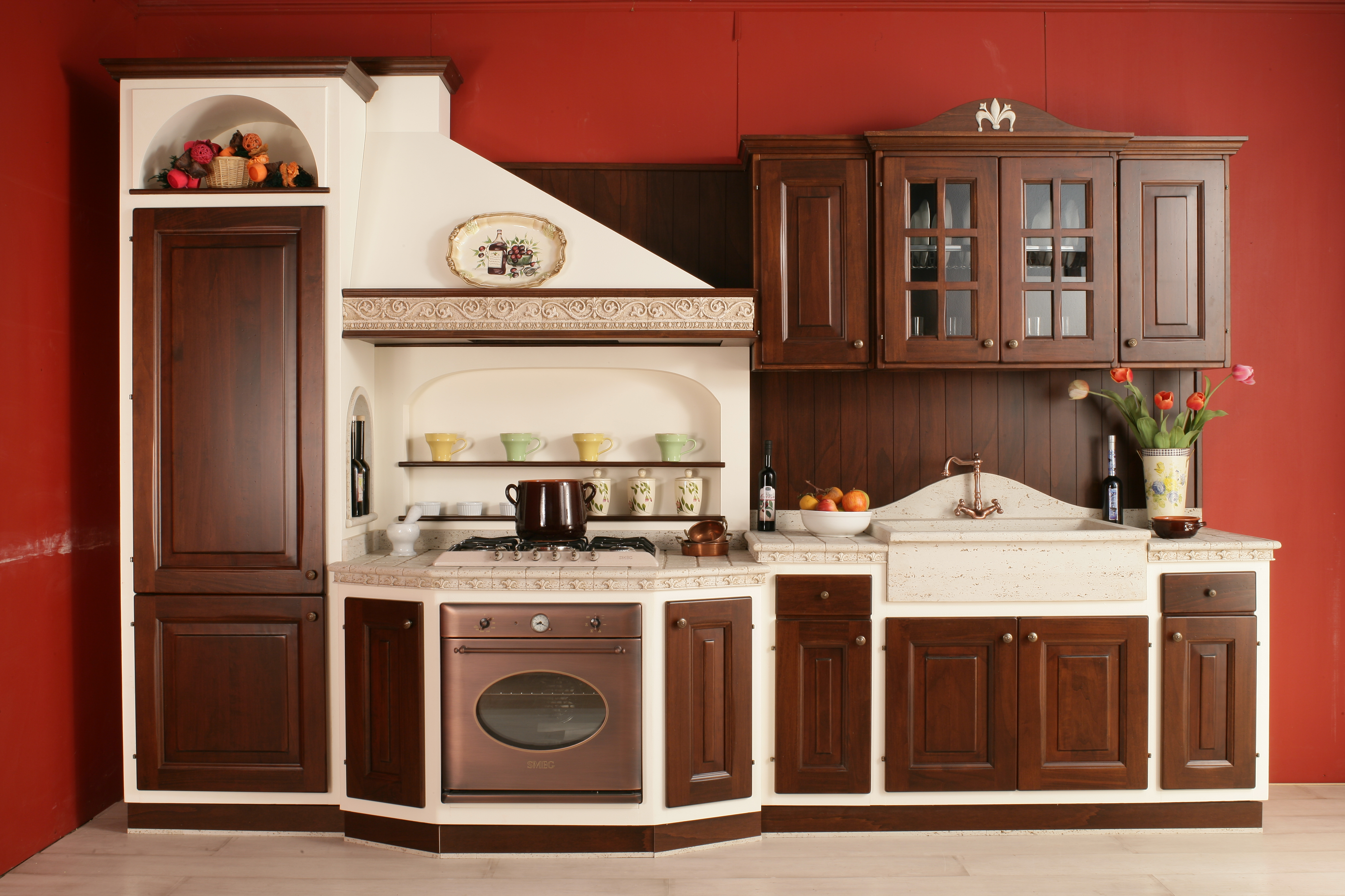 Cucina in finta muratura con struttura in multistrato marino, ante in legno massello e top e lavello in kipstone. Cucina in finta muratura con struttura in multistrato marino, ante in legno massello e top e lavello in kipstone.